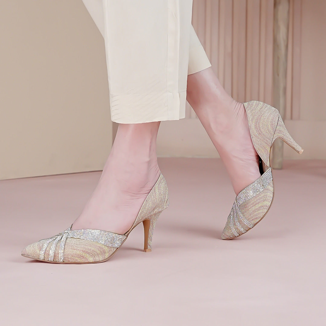 Perfect for wearing with a dress for a special occasion our Glister Gold design give you shimmery. Heel height 3 inches, Upper material glitter PU with Stone work Inside material Single layer PU Sole Java Sheet Size 35 - 42